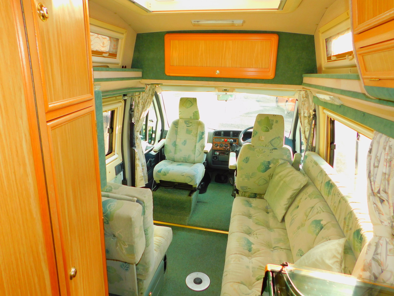 The Midships Lounge and Dining area can easily seat 5 people and features a Long Sofa that you can stretch out on. The Front Captains Passenger Seat Swivels to become part of this area, and you have a choice of 2 different Size Dining Tables that neatly store away in their own dedicated compartments. We also have a drop down cabinet for an led TV. Above this area is a Large Opening Sunroof with built in privacy and fly screen blinds. In fact all of the Double Glazed windows have integrated sliding Privacy blinds and fly screens. We also have the additional forward facing seat with its 3 point Seat Belt which gives us a total of 3. Another bonus is the good size Wardrobe and a plethora of storage throughout including the large cupboard over the cab for your bedding etc.