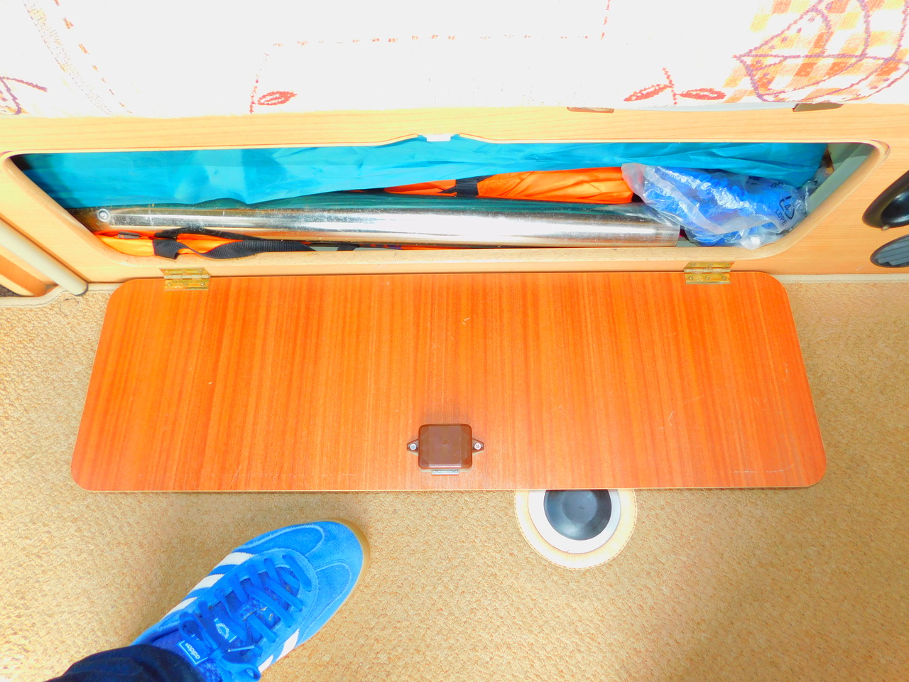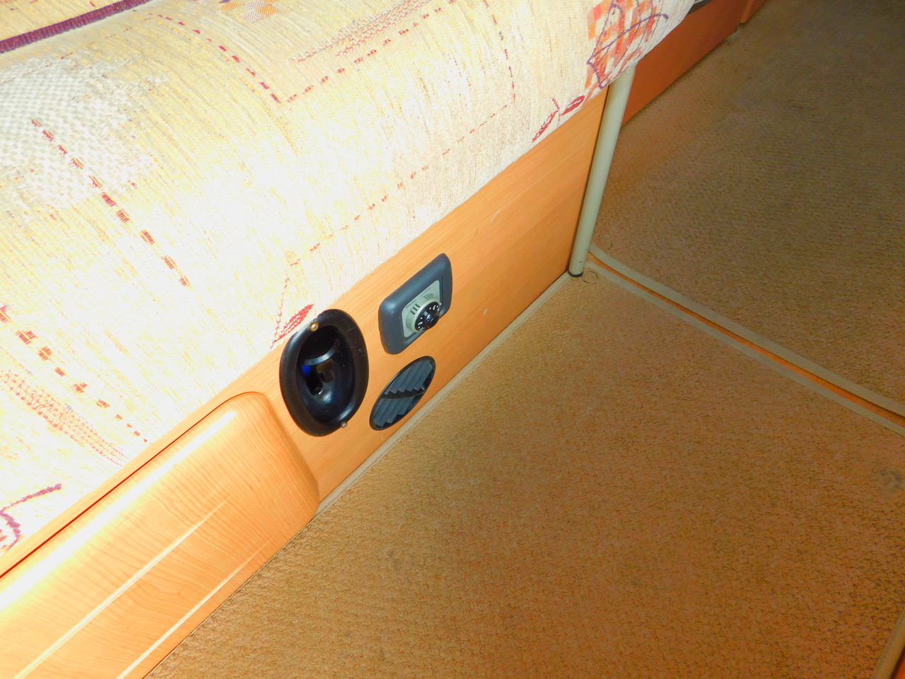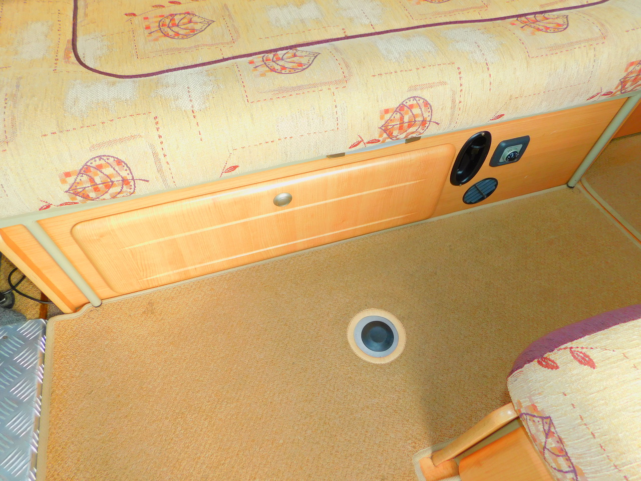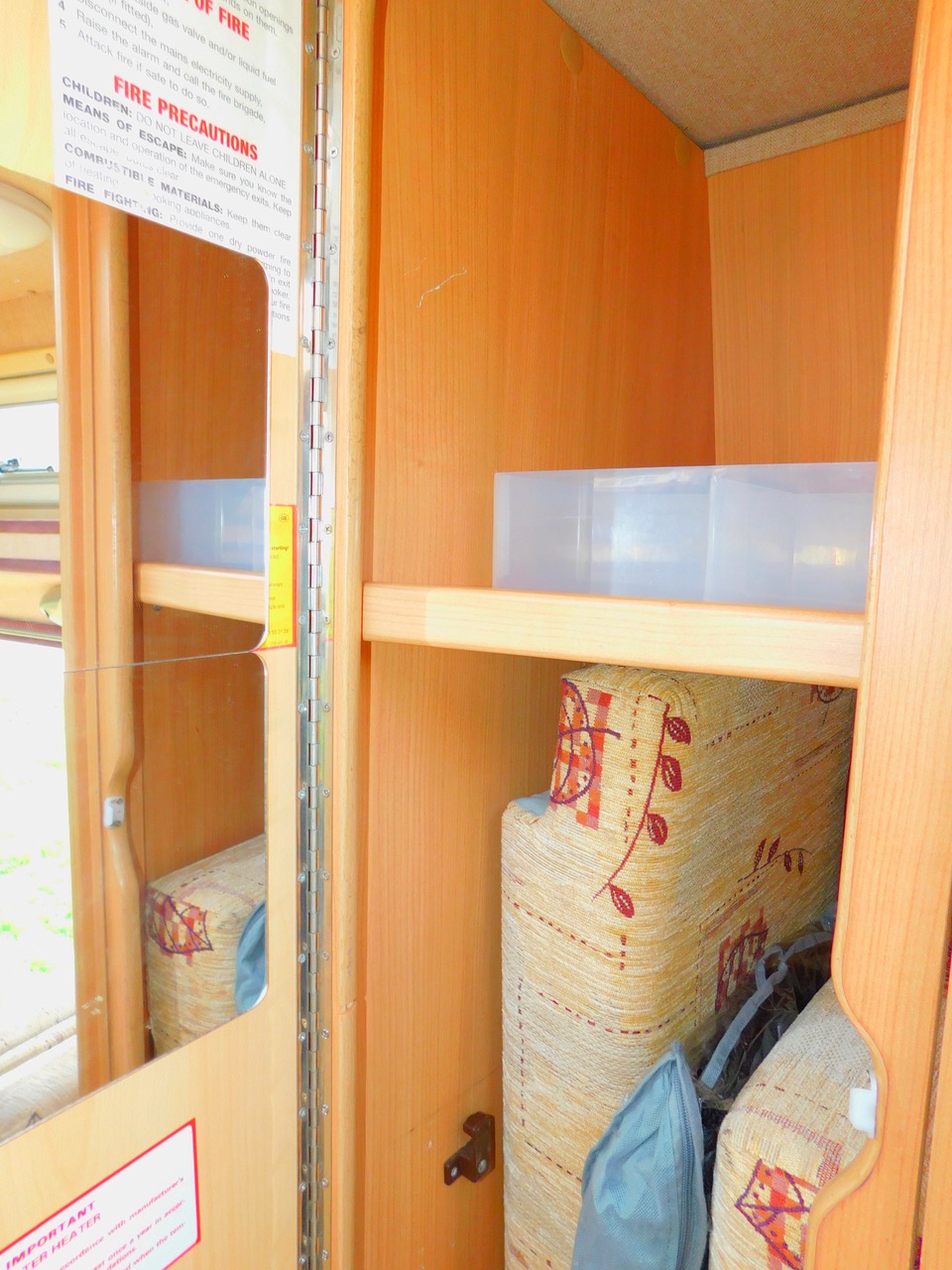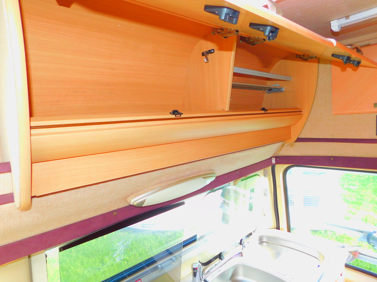 The Midships Lounge and Dining area can easily seat 5 people and features a Long Sofa that you can stretch out on. The Front Captains Passenger Seat Swivels to become part of this area, and you have Dining Table that neatly stores away in its own dedicated compartment. We also have a drop down cabinet for an led TV. We also have plenty of plug sockets. Above this area is a Large Opening Sunroof with built in privacy and fly screen blinds. In fact all of the Double Glazed windows have integrated sliding Privacy blinds and fly screens. We also have the additional forward facing seat with its 3 point Seat Belt which gives us a total of 3. Another bonus is the good size Wardrobe and a plethora of storage throughout including the large cupboard over the cab for your bedding etc.