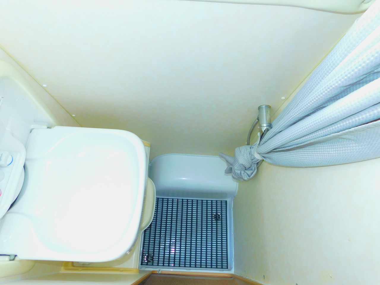 The Shower Room has the flushing TOILET with a thetford cassette as well as a drop down Wash Basin, Shower and a vanity cupboard. Another Excellent feature of this particular model is the ability to create a private changing area via the shower room door that features a Fold Out Screen.