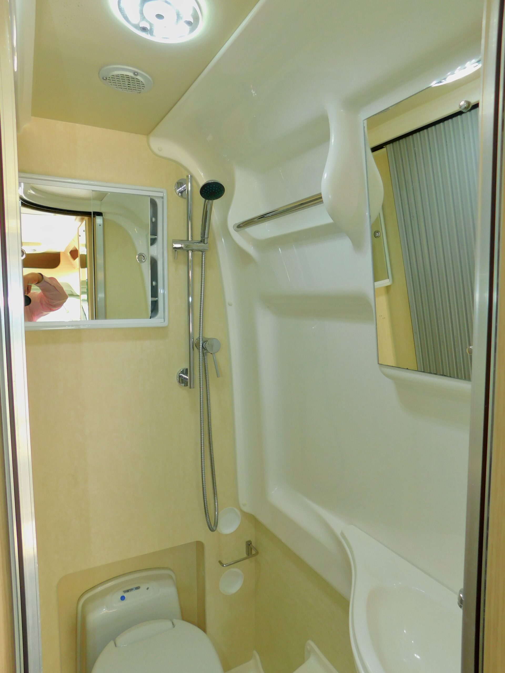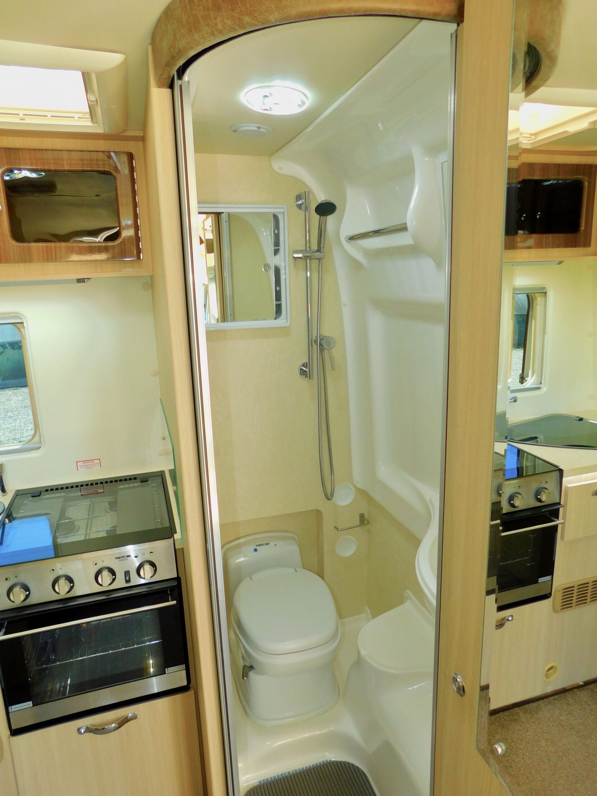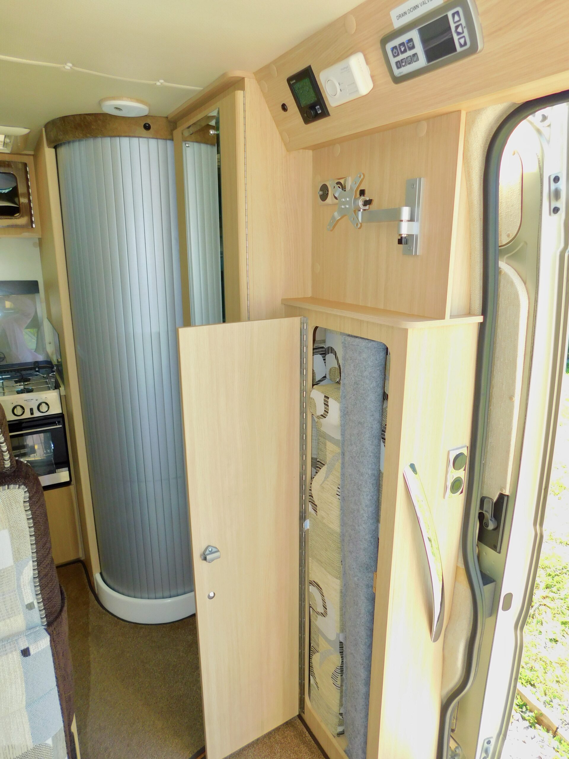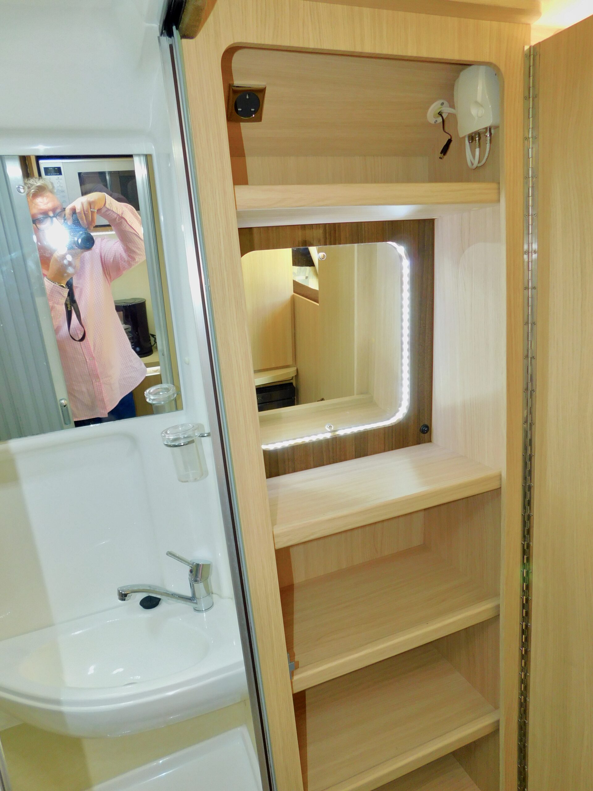 The SHOWER ROOM has the Flushing TOILET as well as a Vanity Basin with an Electric Tap, Shower and a Vanity Cabinet. The sliding Tambour door is a great space saver. One exceptional feature that I love is the way that you can easily create a private dressing area just by closing off a couple of doors. This then reveals a shelving unit with a Built in LED Illuminated Vanity Mirror with a built in 3 point plug for your Hairdyer or Shaver (Brilliant).