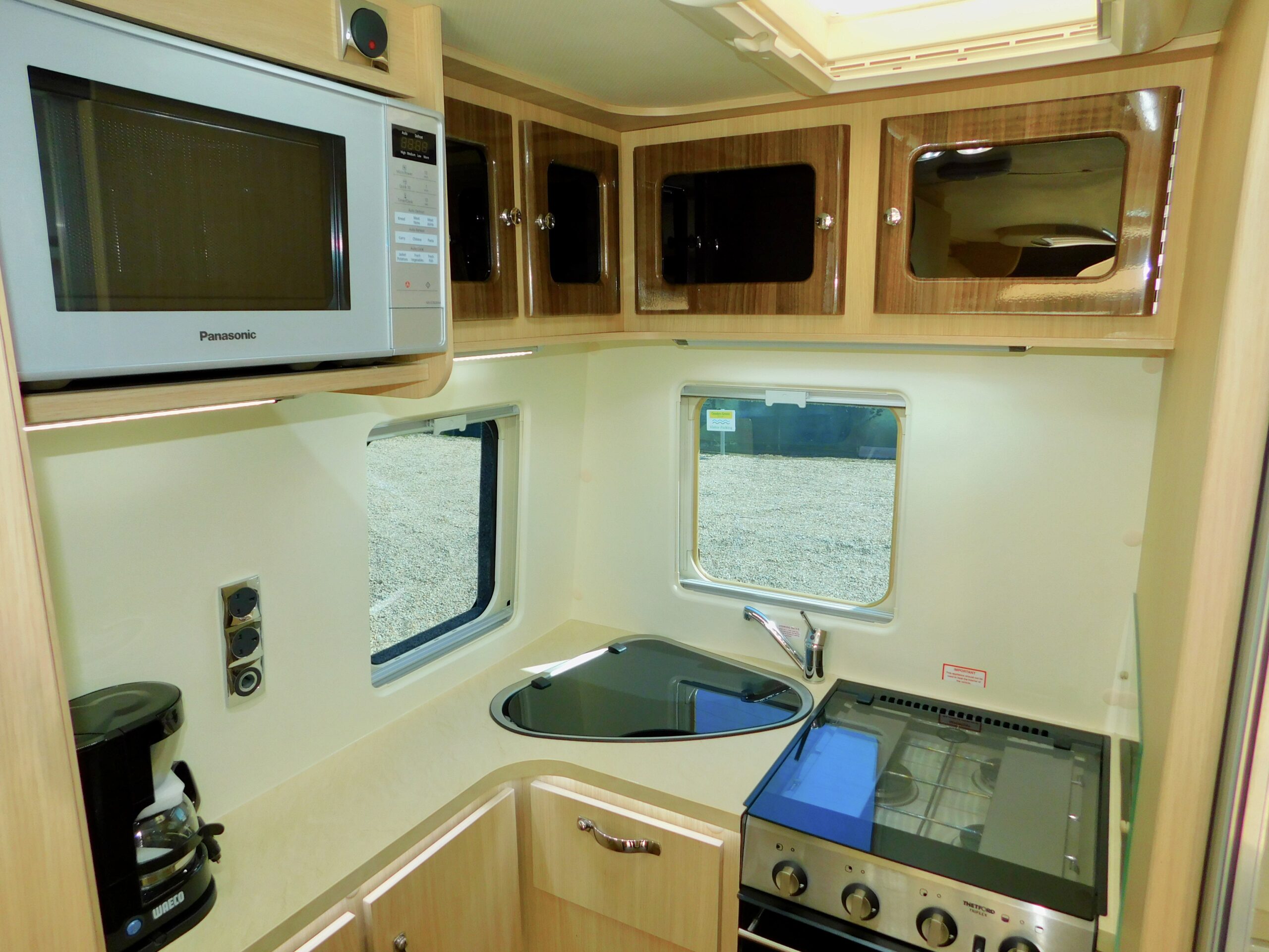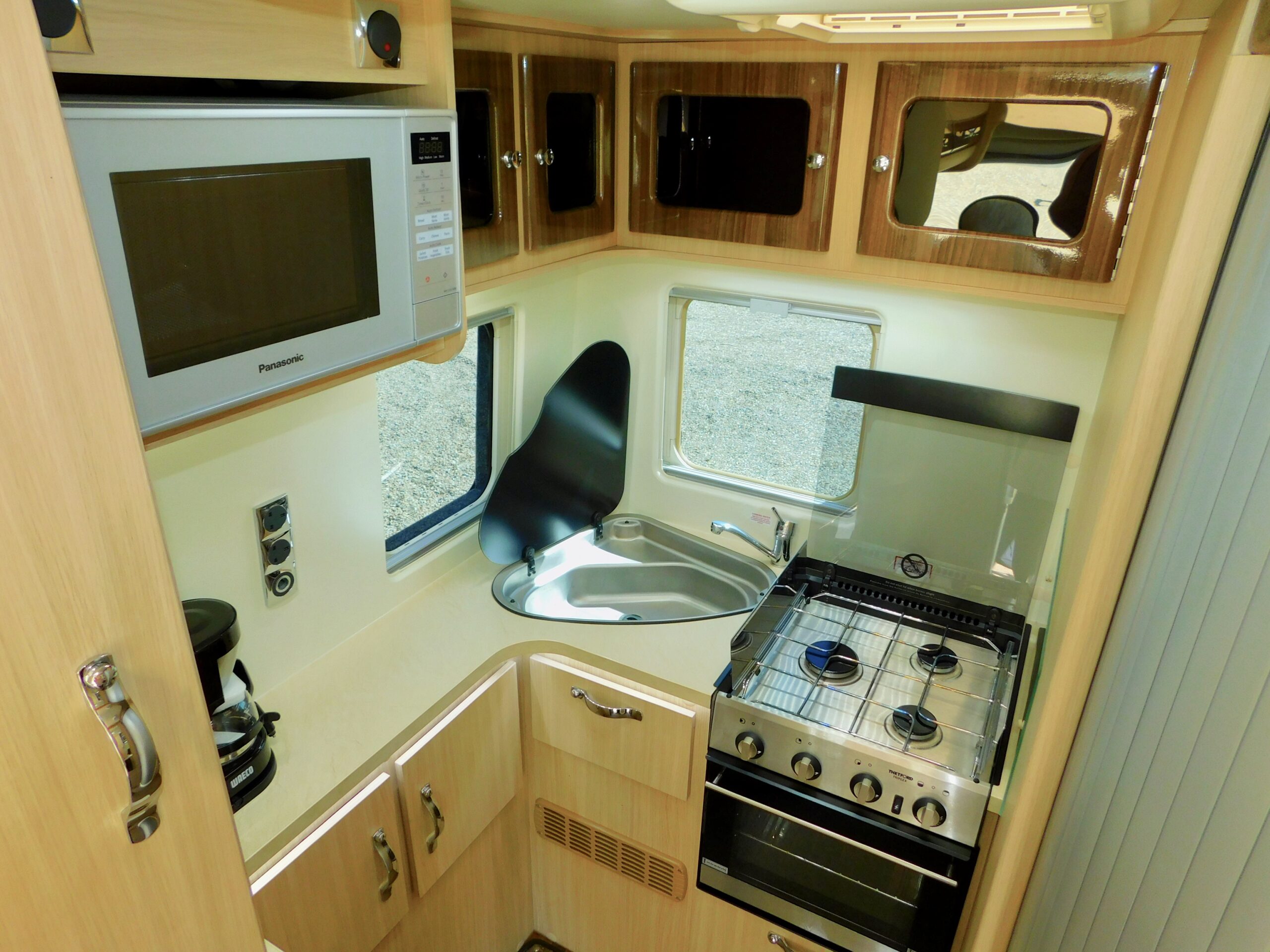 The KITCHEN has a Large 90L Fridge with a Freezer compartment. We have a 3 Burner Gas Hob as well as a Gas Oven and Grill. Generous Worktop, a Sink with an Electric Tap and we even get a Microwave Oven And a Coffee Machine. Plus we have a roof mounted Extractor Fan that also Reverses to distribute Air around the vehicle..