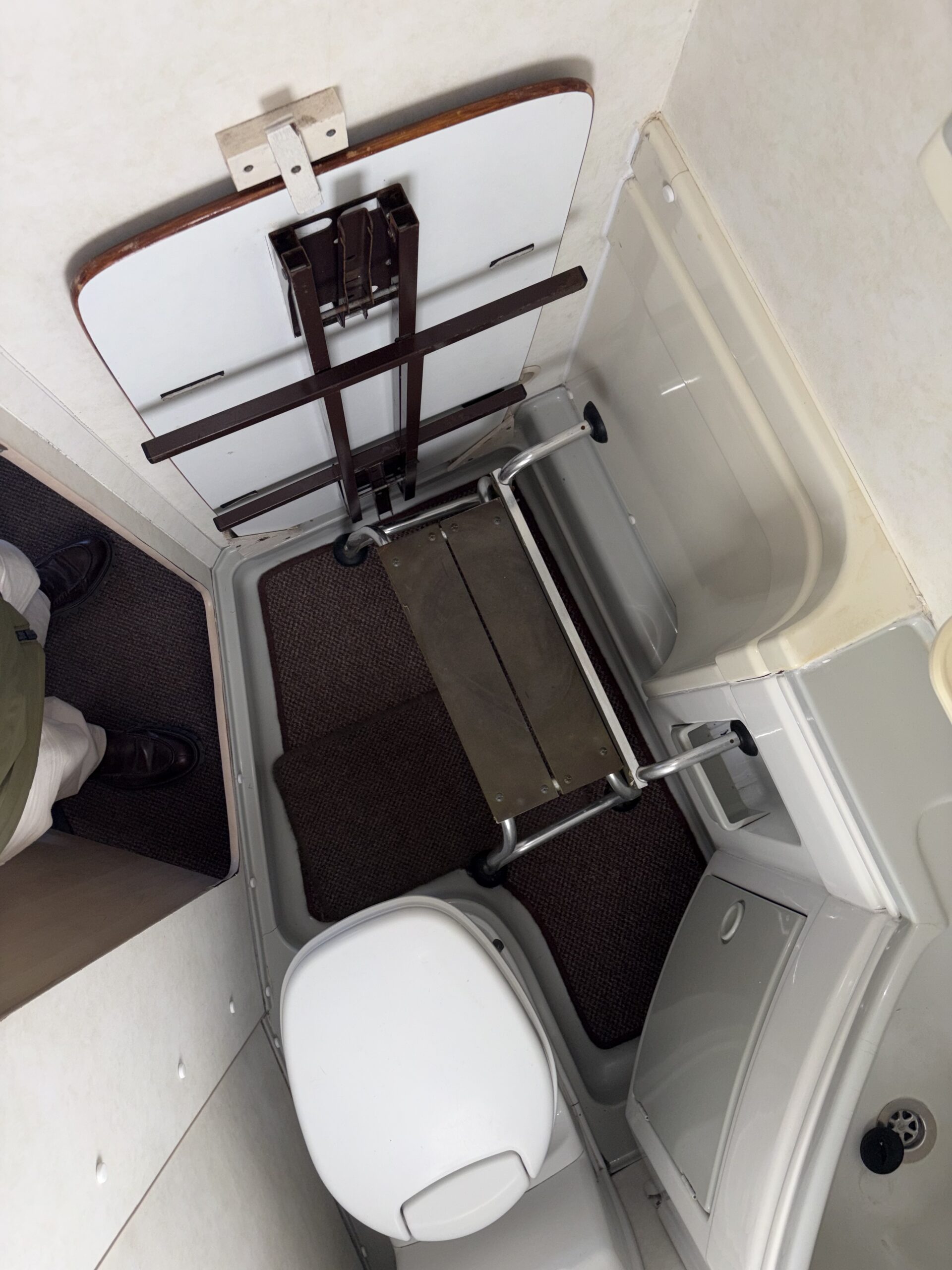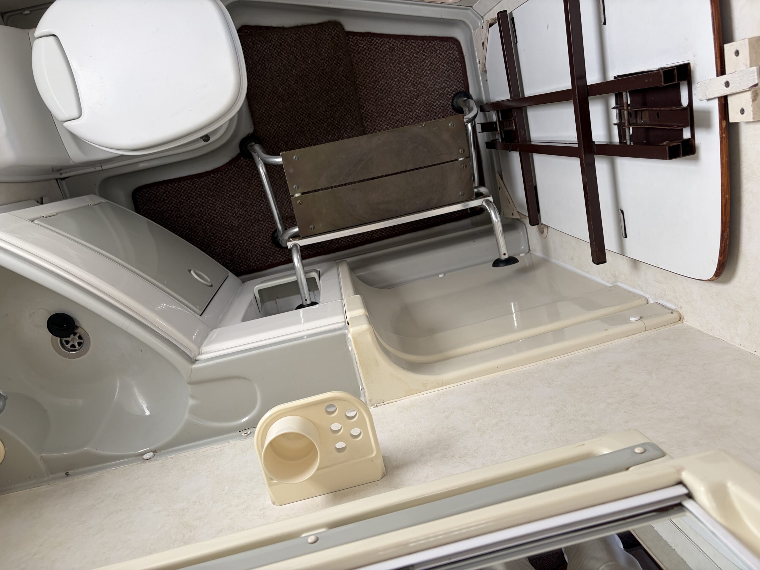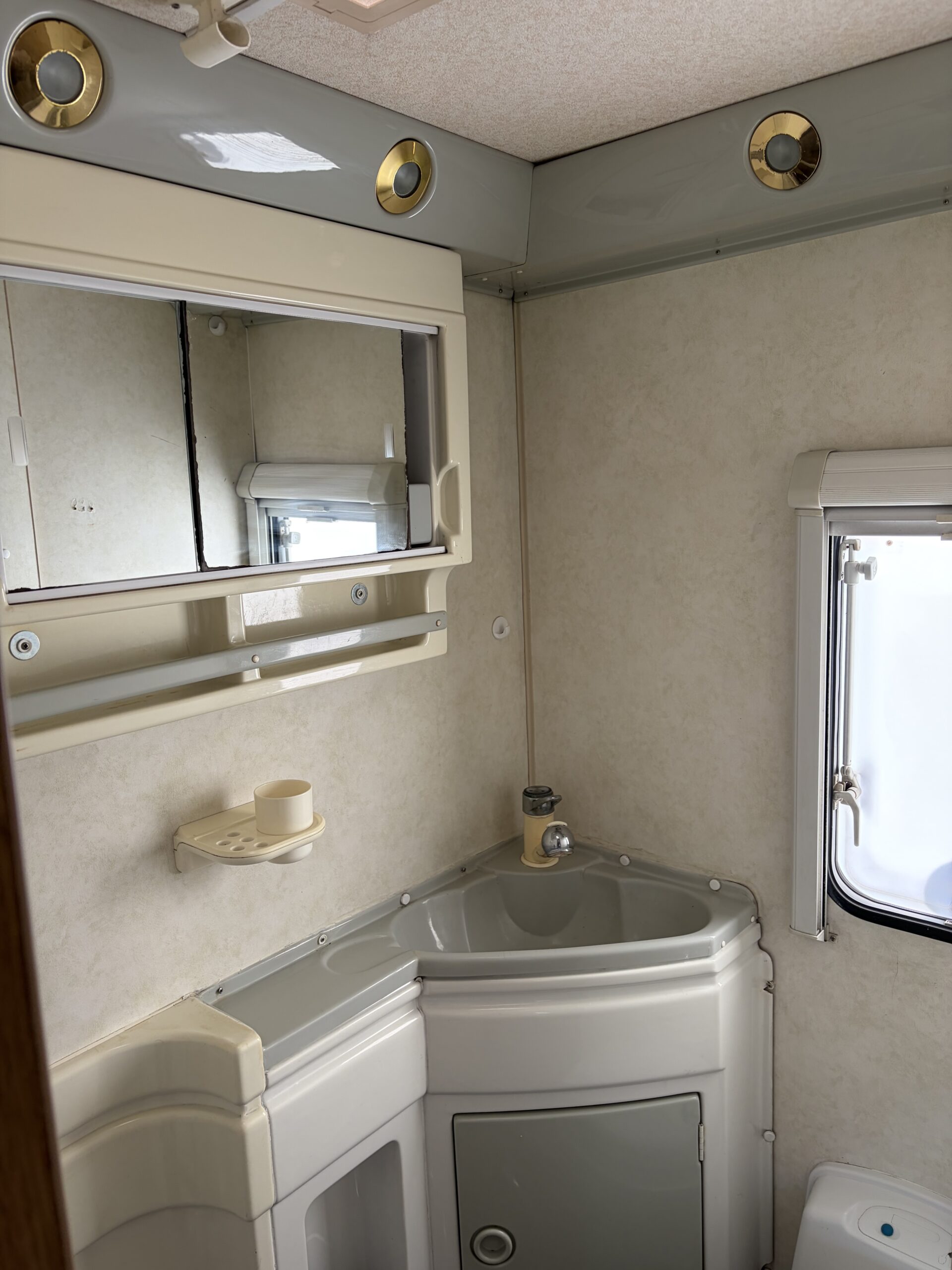 The WASHROOM is super Spacious and has the Shower and the Flushing TOILET with a thetford cassette plus a Sink with and Electric Tap, Great Lighting and Loads of Storage cabinets etc etc.