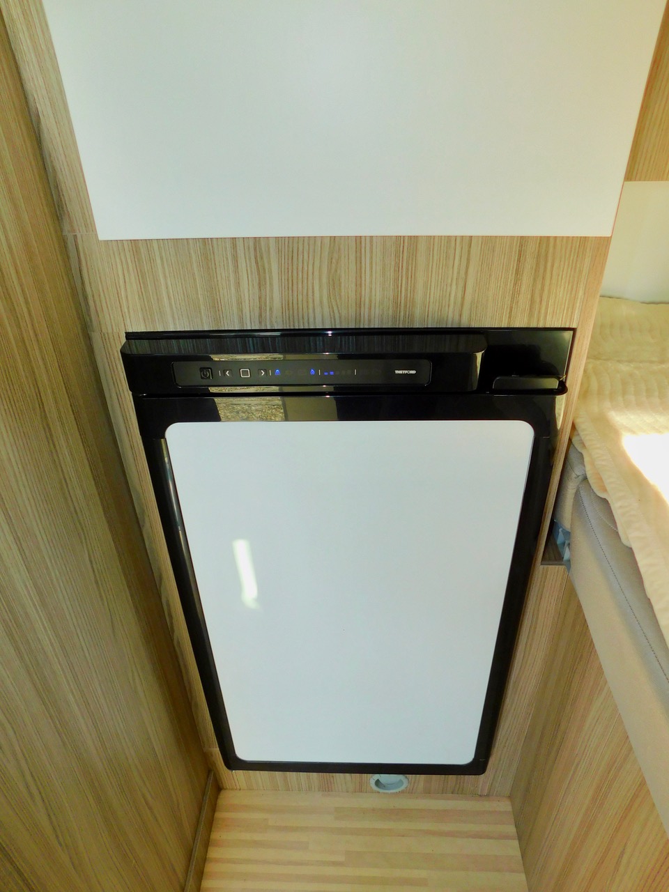 When it comes to mum and dad’s bedtime, the French bed (that’s a lengthways double alongside a wall) positioned here at the offside rear is a decent size and, again, requires no bed-making. This Bed is 1.90m (Or 6 feet 2 Inches) by 1.36m (4 feet 5 Inches) but neither the overhanging (second) wardrobe at the foot, nor the usual tapering bed width, will compromise comfort significantly.