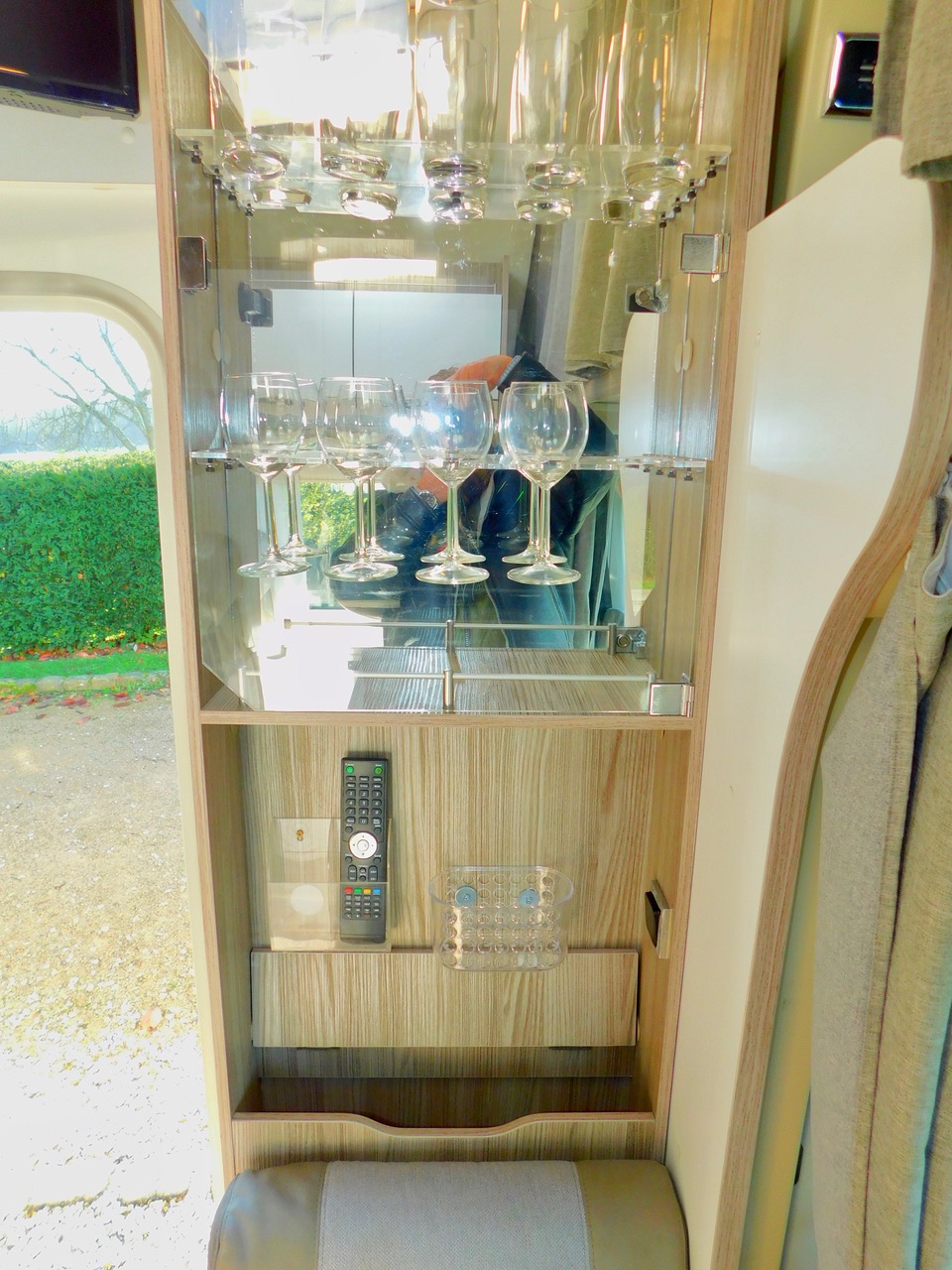 The Lounge and Dining Area has Seating for 5 with its Swivelling Front Driver and Passenger Seats, and the Dining Table has a Swivel Extension to enable all 5 people to Dine in Comfort. There is a Glasses Cabinet as well as an LED TV. There I s also a roof mounted Digital TV Aerial.