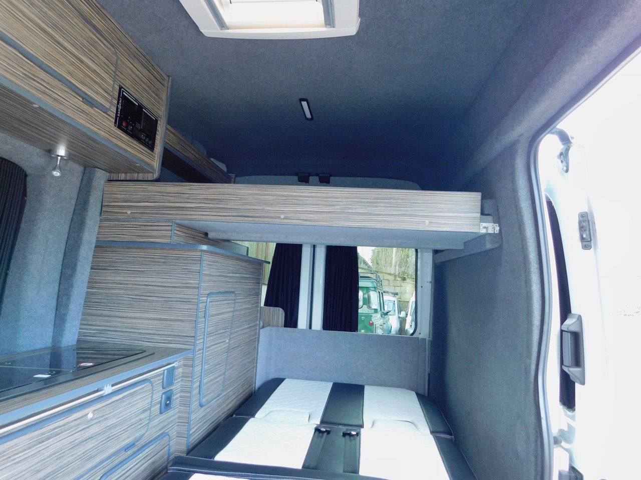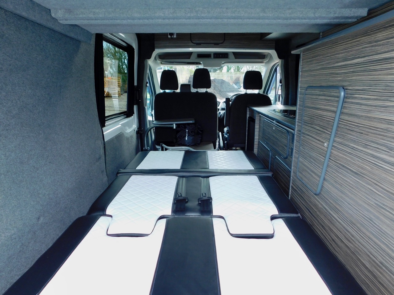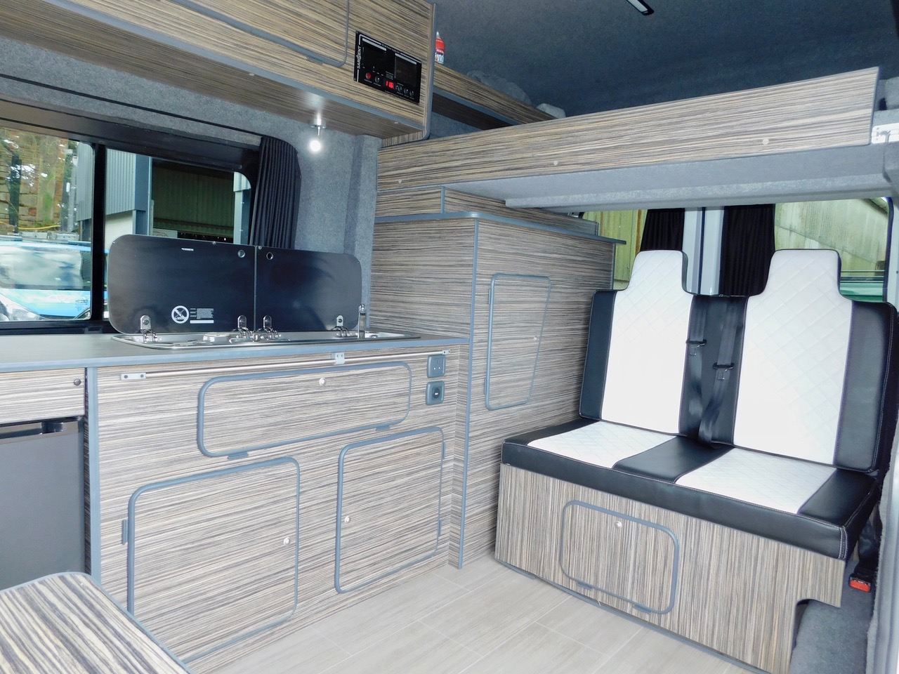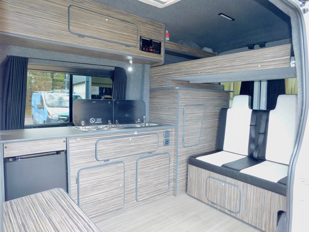 What an Amazing Professionally built Van Conversion! We have Full Standing Height Throughout. 5 x 3 point Seatbelts. 3 to 4 Berth. We also have the Porta Potti TOILET. The Kitchen has a Fridge as well as a Dometic 2 Burner Gas Hob and a Sink with an Electric Tap all housed under Dark Toughened Glass Folding Tops. We also have a Huge amount od Storage in the Kitchen etc and this has beautiful Zebrano style finished doors as well as Zebrano style Worktops. We also have some stylish wood effect flooring throughout. The Rear Rock n Roll Bed has 2 Forward Facing Seats with the Rear Seat Belts. The Cab has the 3 x Seats with 3 point Seat Belts. The twin opening Rear Doors open to reveal a very large rear storage Cupboard with a Shelf and the Folding and Sliding Dining Table is housed on one of these doors. The Camper also has the sliding black out curtains fitted throughout, as well as led lighting.