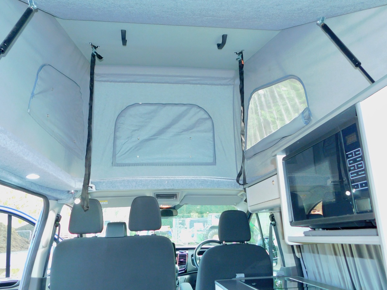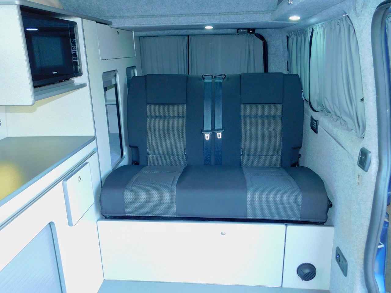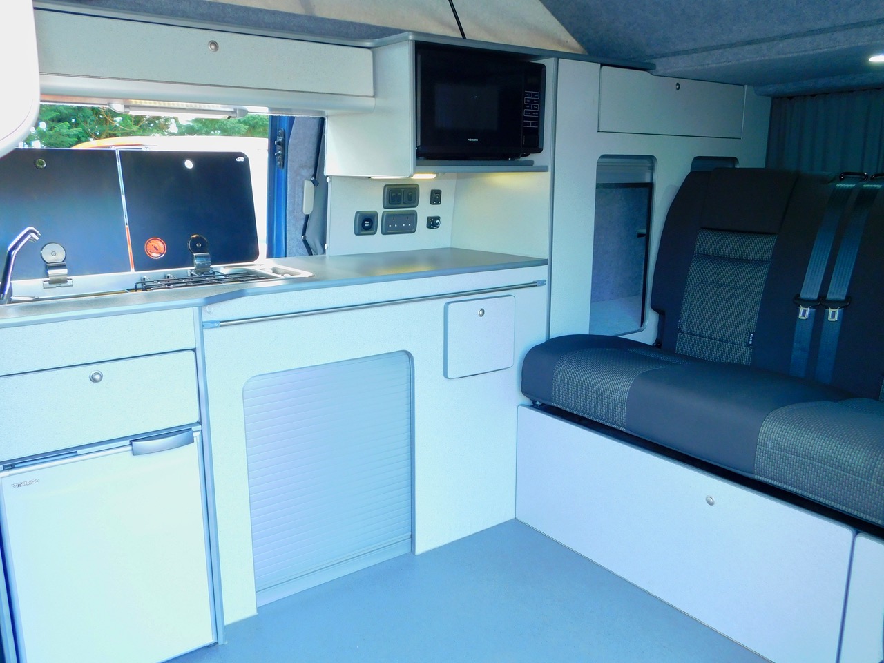 Salisbury Conversions offer Bespoke Conversion and this one includes a Total of 5 Seatbelts. We have the downstairs crash tested RIB rear seat with the 2 additional Seat Belts which easily converts to a Double Bed and Upstairs in the lift up Bed you can sleep either 2 Children or a good size Adult. We also get fitted Central Heating, Led Lighting and plenty of 3 pin and USB Sockets. The Double Front Seat Swivels to face the rear. There is Plenty of Floorspace and built in window blinds all round. The Generous Kitchen has a Double Gas Burner, Stainless steel sink with an electric tap as well as a Fridge with a Freezer compartment. We also have a built in Microwave.