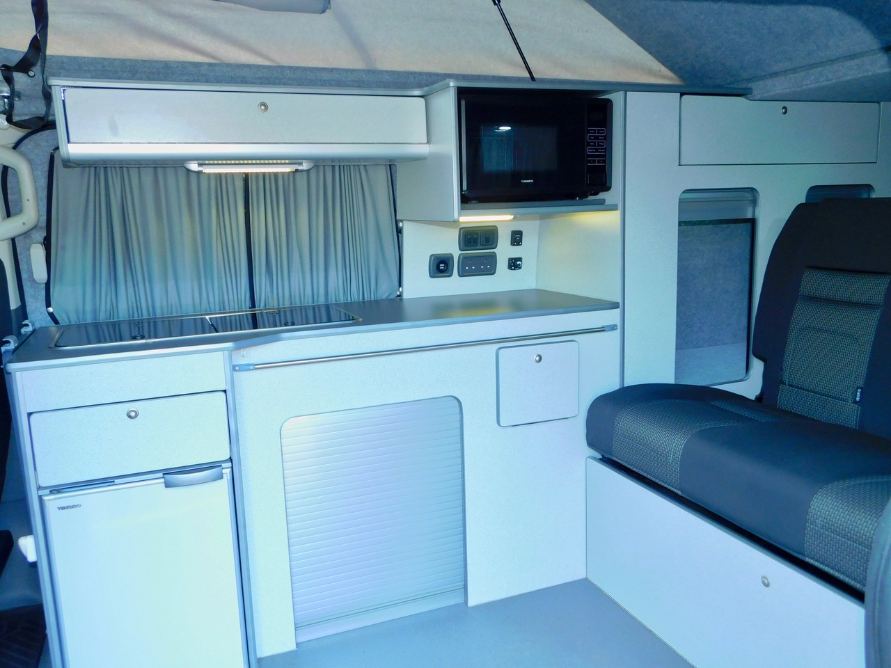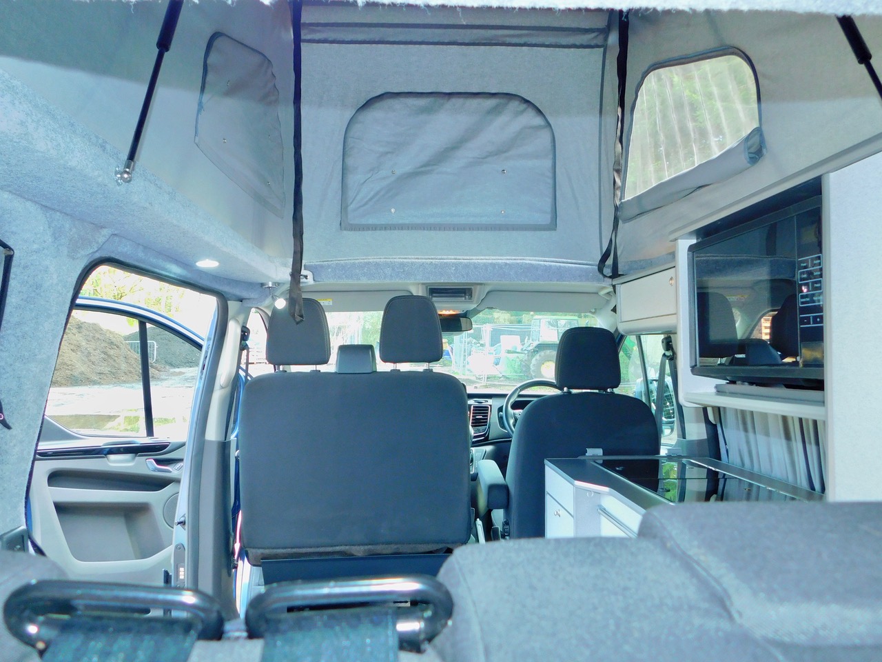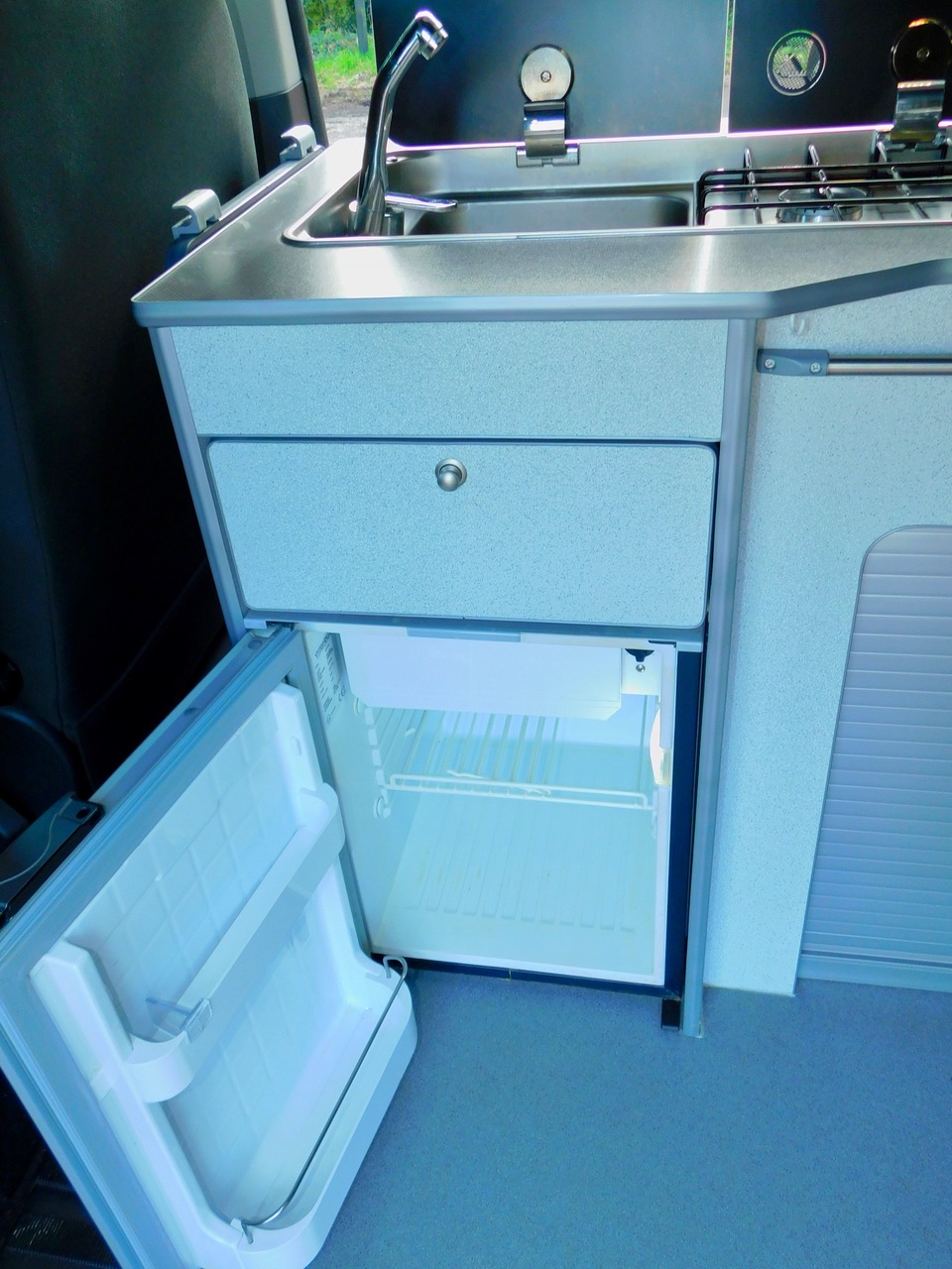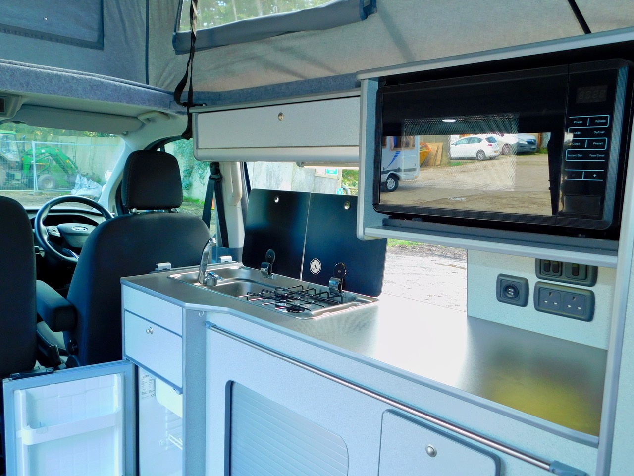 Salisbury Conversions offer Bespoke Conversion and this one includes a Total of 5 Seatbelts. We have the downstairs crash tested RIB rear seat with the 2 additional Seat Belts which easily converts to a Double Bed and Upstairs in the lift up Bed you can sleep either 2 Children or a good size Adult. We also get fitted Central Heating, Led Lighting and plenty of 3 pin and USB Sockets. The Double Front Seat Swivels to face the rear. There is Plenty of Floorspace and built in window blinds all round. The Generous Kitchen has a Double Gas Burner, Stainless steel sink with an electric tap as well as a Fridge with a Freezer compartment. We also have a built in Microwave.