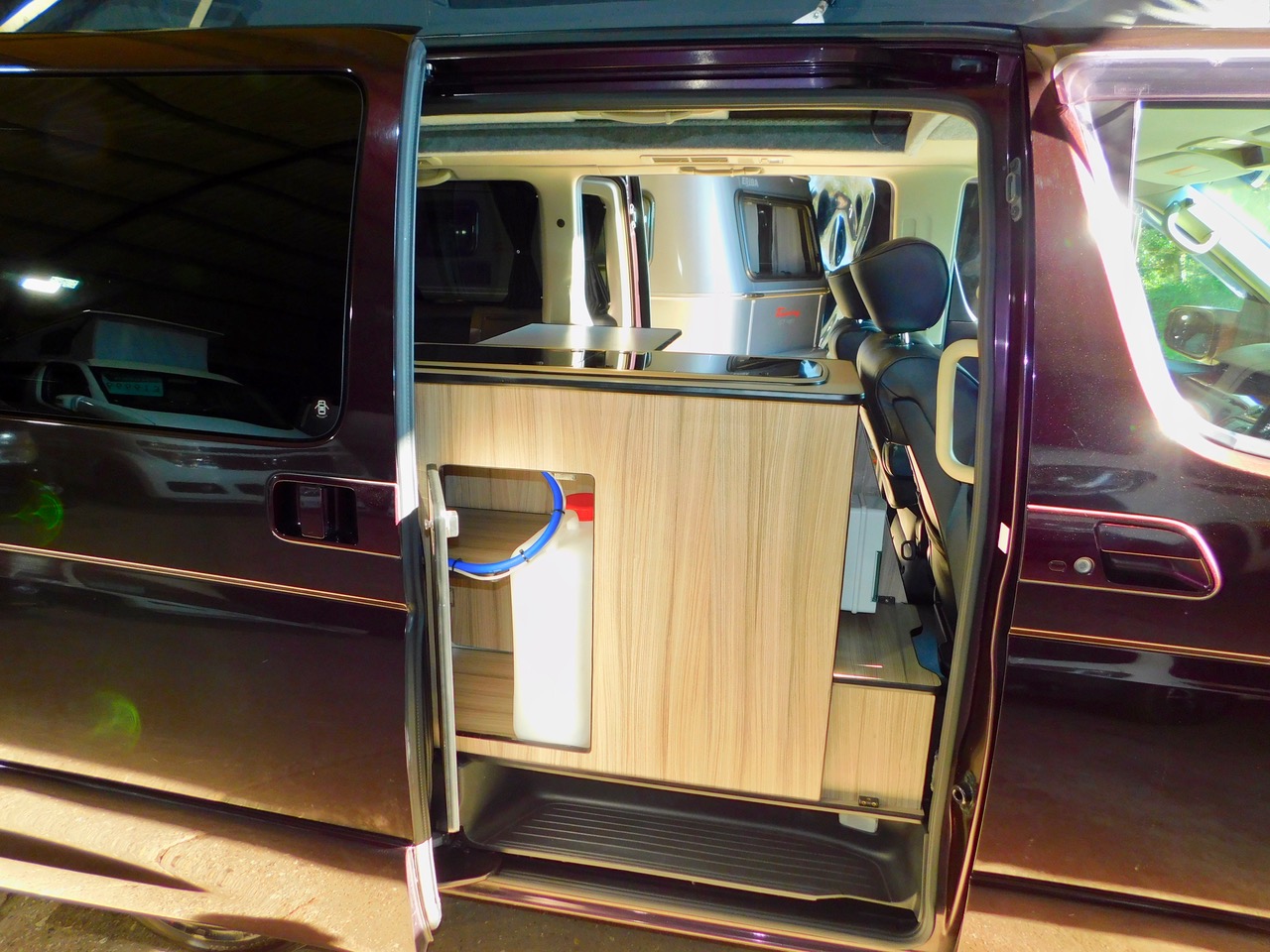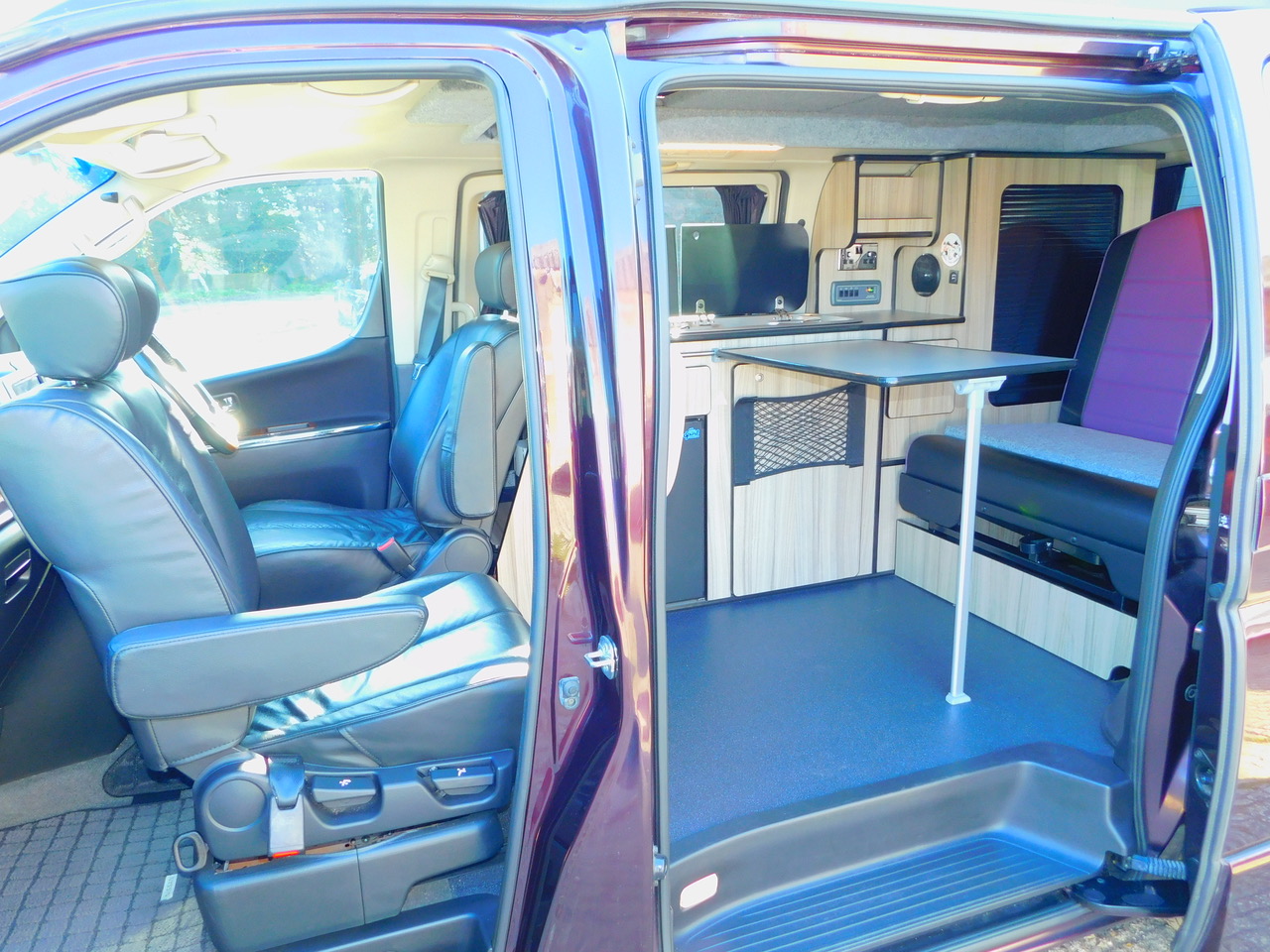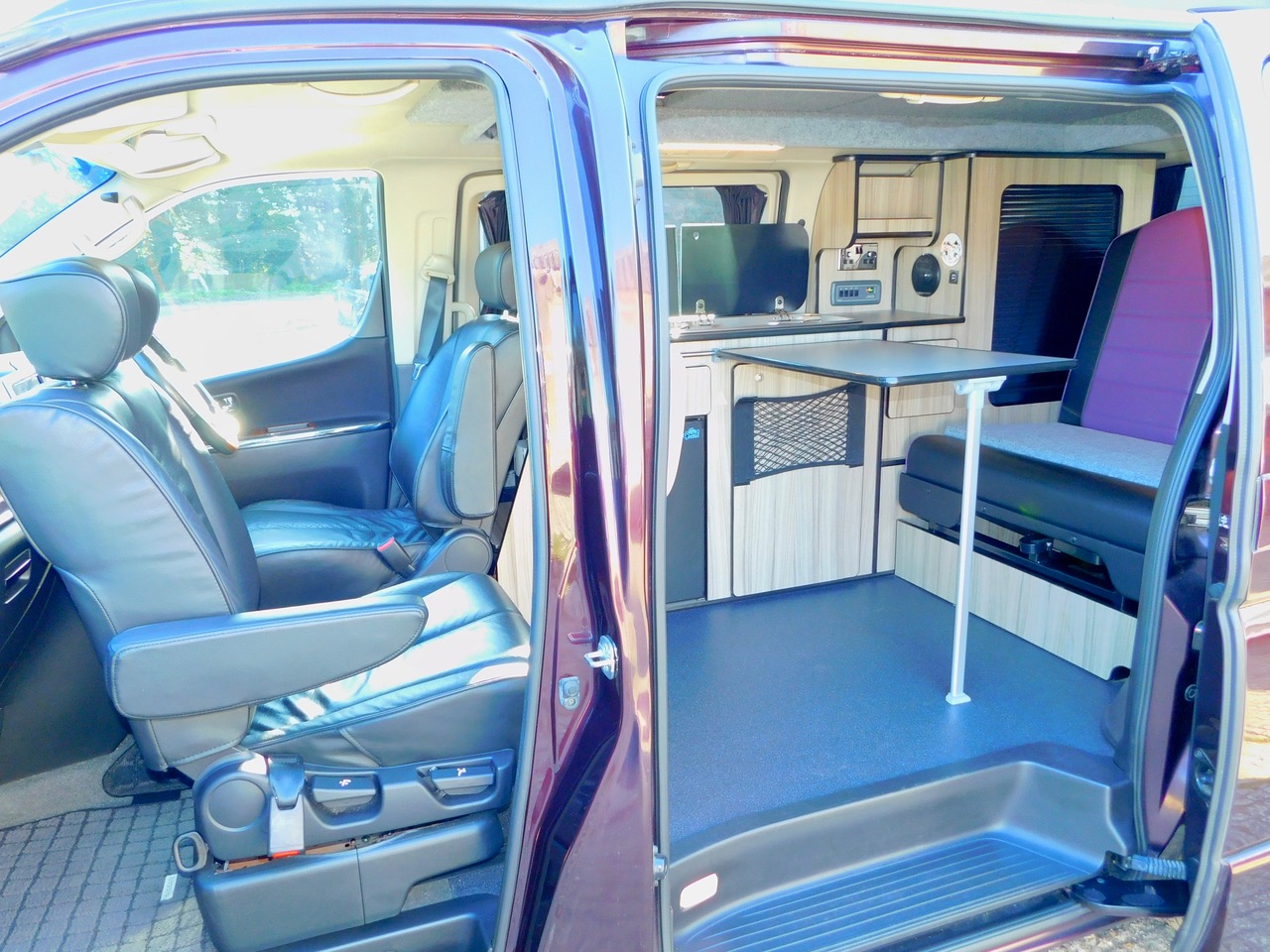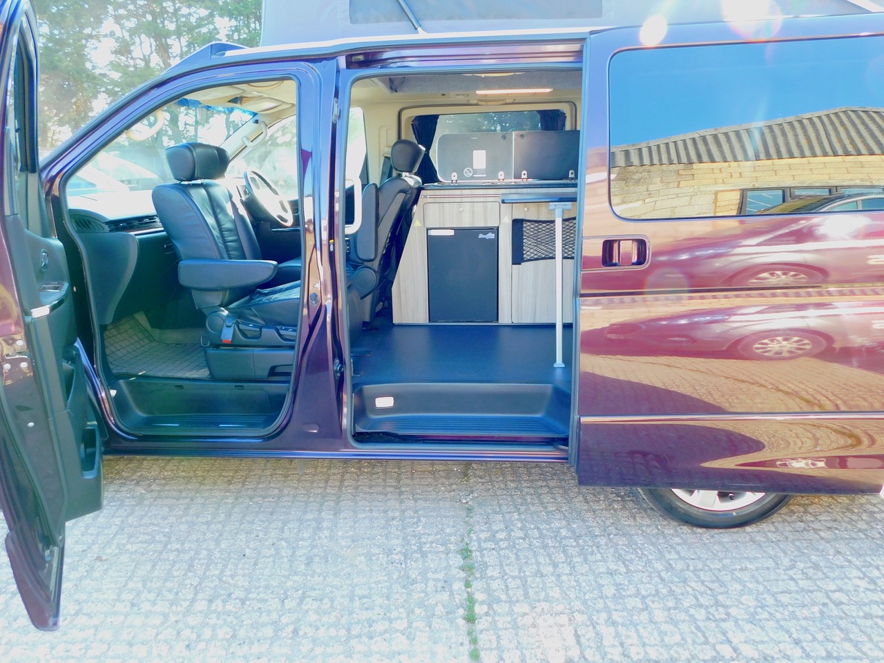 A Super conversion in excellent condition throughout and carried out by the well respected Free Spirit Conversions in Chichester giving a premium quality 2 Plus 2 Berth 3.5 Petrol Automatic Nissan Elgrand Campervan. This model benefits from a Large 120W Roof Mounted Solar Panel to keep the Batteries topped up. This beautiful example is one of the later facelift 2008 models that was imported and very recently Converted. Only 55,766 miles. Please remember that this is the harder to find switchable 2 wd to 4 wd Model. We have electronic Climate Control Air Conditioning and the Electric sliding side doors on both sides, central locking, electric windows and electric folding door mirrors, the Garmin UK and Europe Sat Nav system. You can even use this as your everyday luxury car. Benefitting from a top quality Elevating roof (The bed boards are in this model to make this a 4 berth). We have a side Kitchen finished in high quality Dritwood Laminate Cabinetry with a Dometic 2 burner gas hob and sink with an Electric Tap, a Vitrifigo 12 volt fridge/freezer, a rock’n’roll bed with 2 x 3 point seat belts, giving us 4 in Total. There is Central Locking, Electric Folding Door Mirrors, stylish Led Lighting, Internal roof lights, Window Curtains, a fitted Awning Rail, a space saving Tambour Wardrobe door and 240 volt electrical Hook Up with a fitted Leisure battery to cater for all your electrical needs. We also have vinyl flooring and a removable Dining Table, Plus the Swivelling Front Passenger Seat.